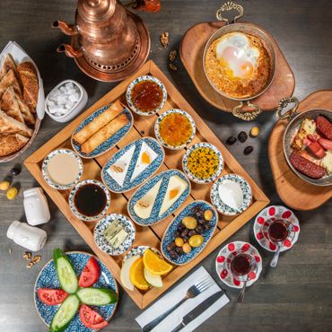 Indulge in the rich culinary tradition of a traditional Turkish breakfast at Bursa Restaurant, served daily from 9 am to 4 pm. Our breakfast spread is a delightful assortment of flavors and textures, designed to provide a hearty an satisfying start to your day.